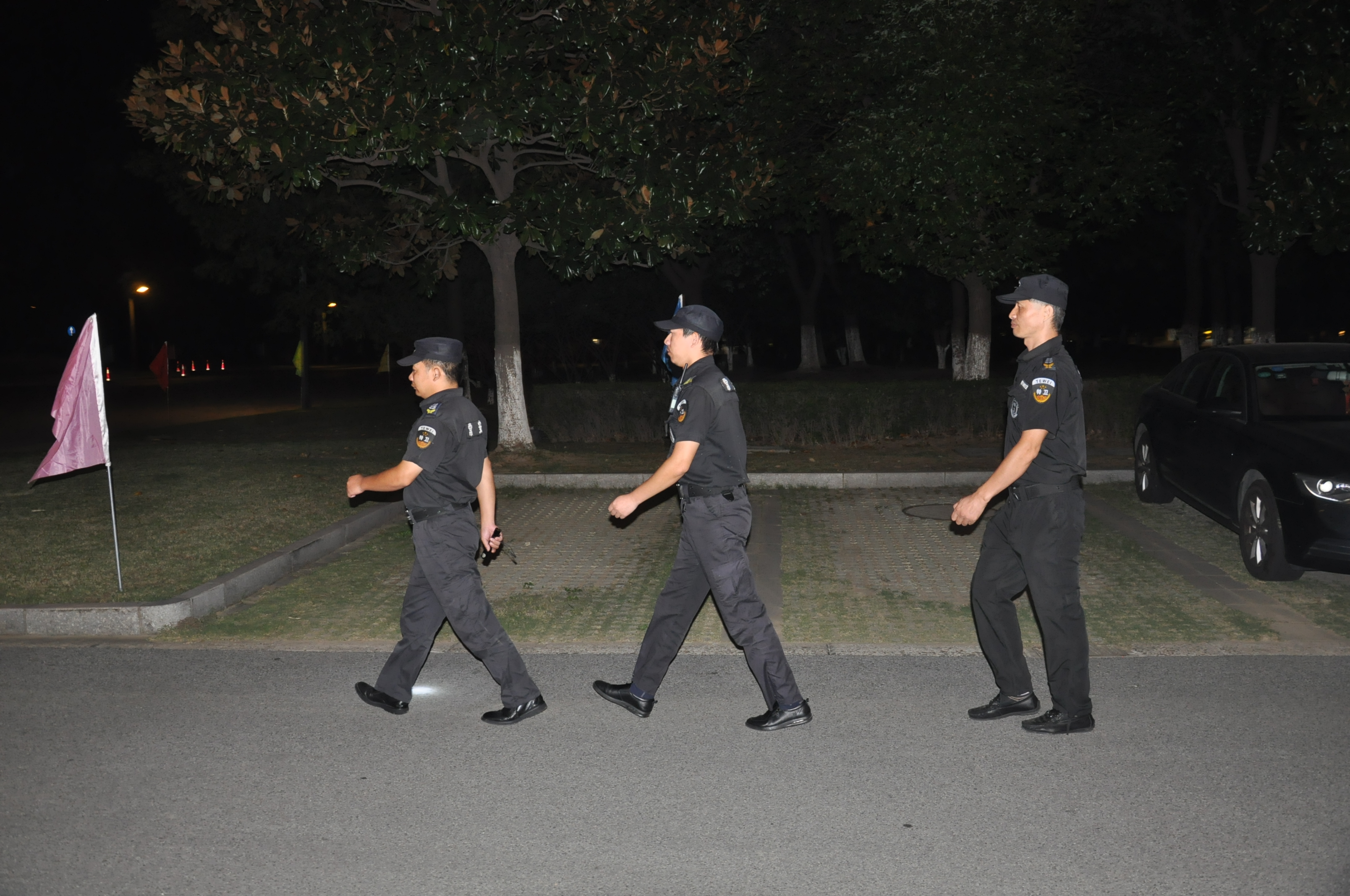 夜幕降臨了,馬路對面的街道上霓虹燈閃爍,游玩的人們熙熙攘攘,而我們可敬的保安員們個個精神抖擻,四人一組地走在夜巡的道路上,路燈下拉長的是他們盡忠職守的身影,訴說著常安保安人舍小家為大家的情懷。